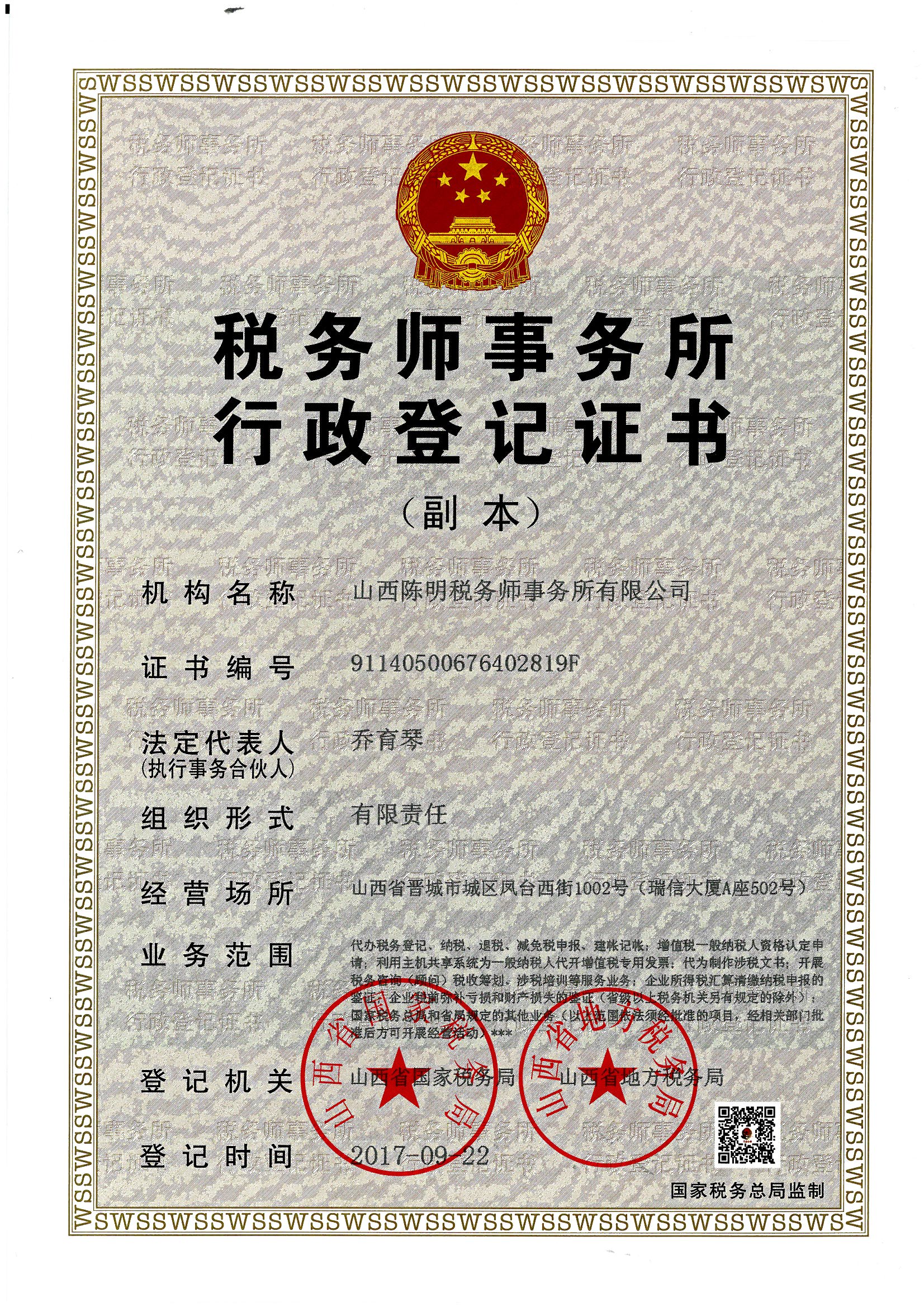 稅務師事務所登記證書